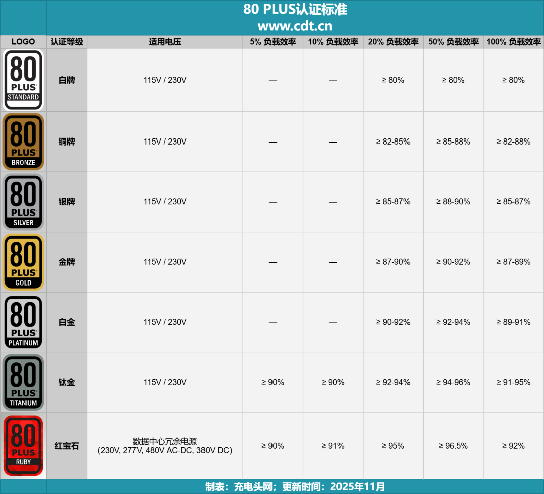 Ruby紅寶石認證是80PLUS 體系中面向數據中心的新高等級標準,于2025年提出,主要針對230V、277V、480V交流以及380V直流輸入的機架式冗余電源。在5%~100%全負載范圍內,它對效率和功率因數設定了明顯高于傳統白金、鈦金的門檻,例如在20%與50%負載點要求接近95%~96.5%的轉換效率,并在20%以上負載階段要求更高的功率因數。通過Ruby認證的電源,能夠在高密度機房場景中進一步壓縮能耗損失,為數據中心整體能效優(yōu)化提供更大的空間。