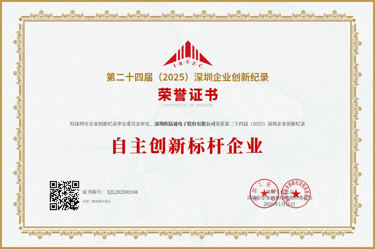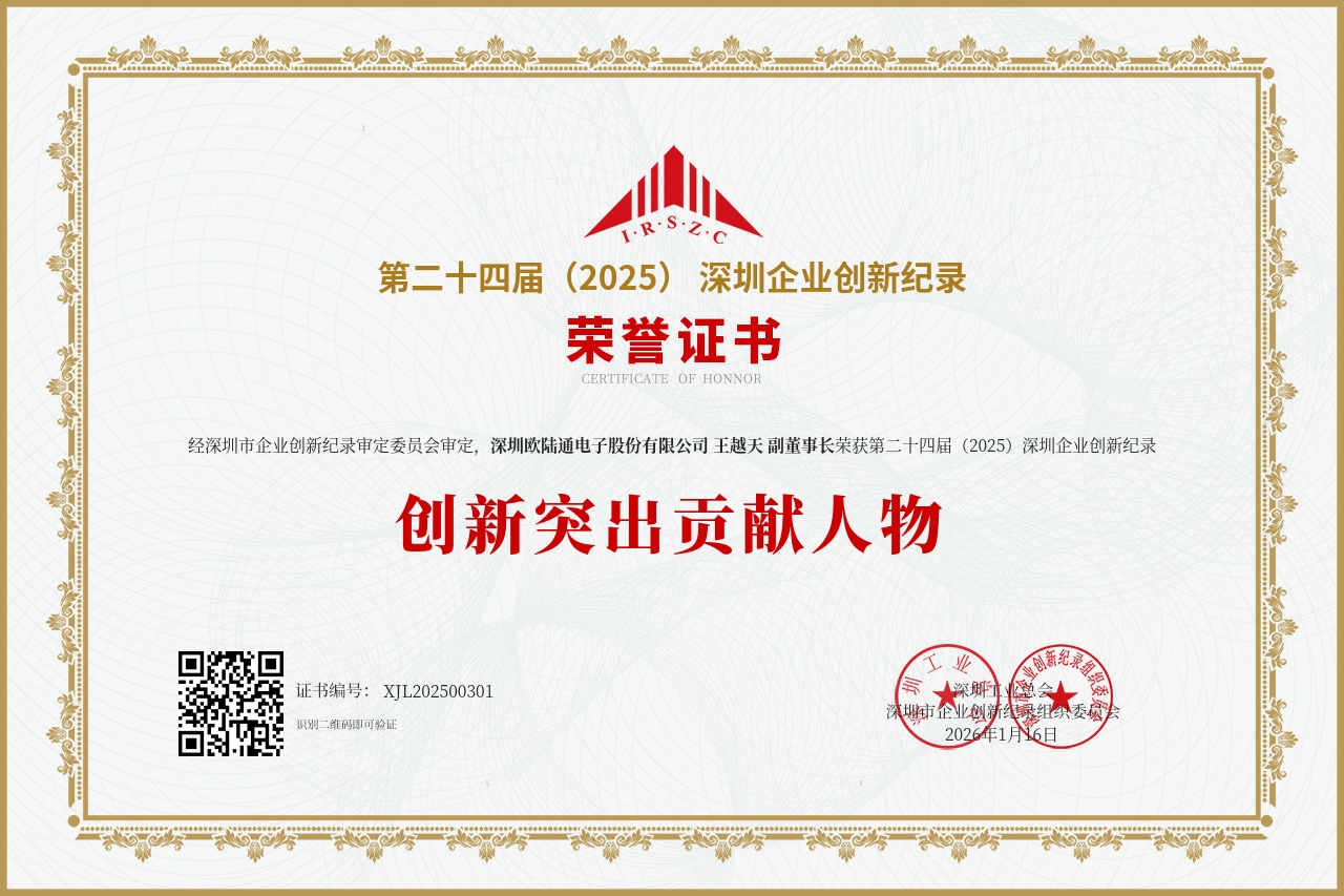 憑借在技術創(chuàng)新、區(qū)域產(chǎn)業(yè)引領、社會責任踐行等維度的綜合表現(xiàn),歐陸通一舉斬獲九項大獎。歐陸通入選“2025粵港澳大灣區(qū)企業(yè)創(chuàng)新力榜單-創(chuàng)新成就榜”,榮獲“深圳工匠培育示范單位”、“2025年度履行社會責任杰出企業(yè)”、“第二十四屆深圳企業(yè)創(chuàng)新紀錄-自主創(chuàng)新標桿企業(yè)”獎以及兩項“第二十四屆深圳企業(yè)創(chuàng)新(中國)紀錄”;歐陸通董事長兼總經(jīng)理王合球先生,榮獲“2025年度履行社會責任杰出人物”;歐陸通副董事長王越天先生,入選“2025粵港澳大灣區(qū)企業(yè)創(chuàng)新力榜單-創(chuàng)新杰出人物榜”,榮獲“第二十四屆深圳企業(yè)創(chuàng)新紀錄-創(chuàng)新突出貢獻人物”。