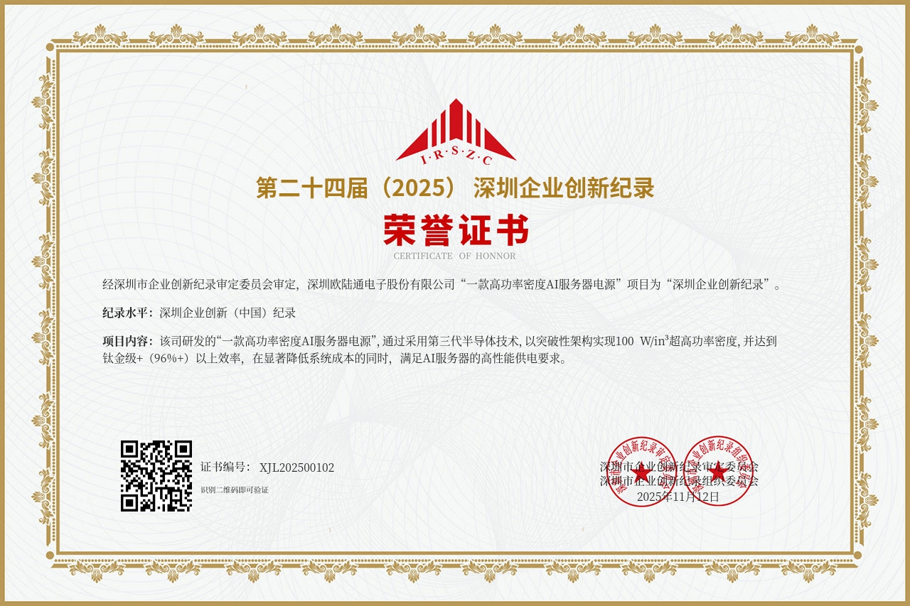 其中,歐陸通申報的“一款高功率密度AI服務器電源”、“一款大功率PoE網(wǎng)絡通訊電源”兩個項目被審定為“第二十四屆深圳企業(yè)創(chuàng)新(中國)紀錄”,并入選第二十四屆深圳企業(yè)創(chuàng)新紀錄“自主創(chuàng)新標桿企業(yè)”。同時,公司副董事長王越天先生獲授“第二十四屆深圳創(chuàng)新紀錄——創(chuàng)新突出貢獻人物”。